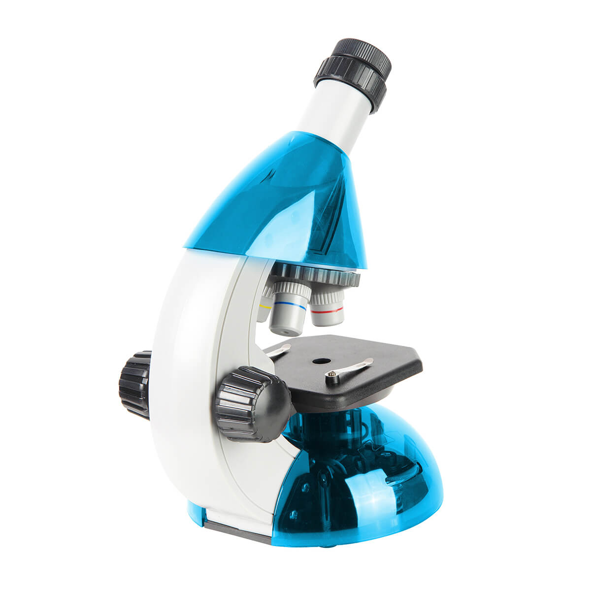Оптический прибор с увеличением 40x-640x. Предусмотрен круглый предметный столик с регулируемой светодиодной подсветкой и набором диафрагм. Револьверное поворотное устройство рассчитано на три объектива с масштабированием 4, 10, 40 крат. Микроскоп работает от двух пальчиковых батареек, что позволяет проводить опыты даже на улице. Насадка монокулярного типа может наклоняться на 45 градусов. В комплектацию входят предметные и покровные стекла, мензурка с мерными делениями, емкость, наклейки, пинцет, пипетка и флакон.